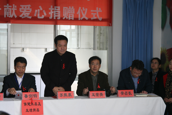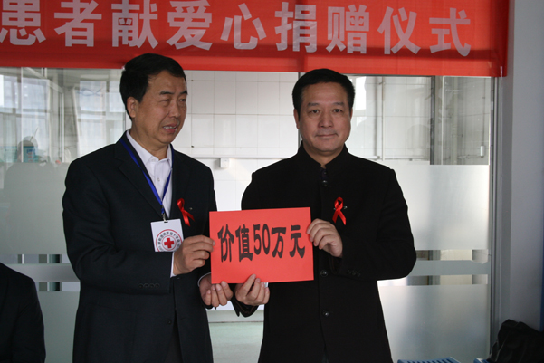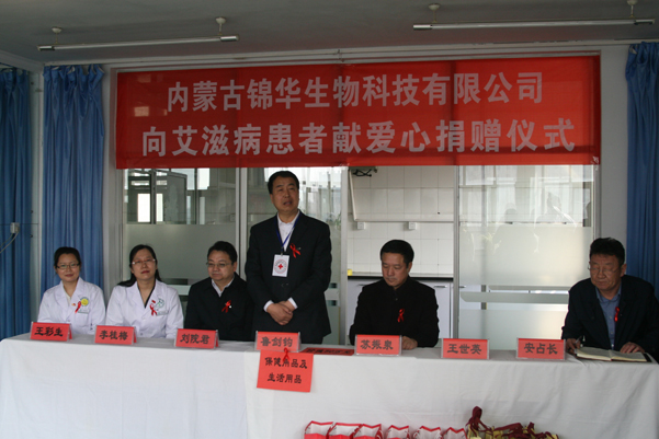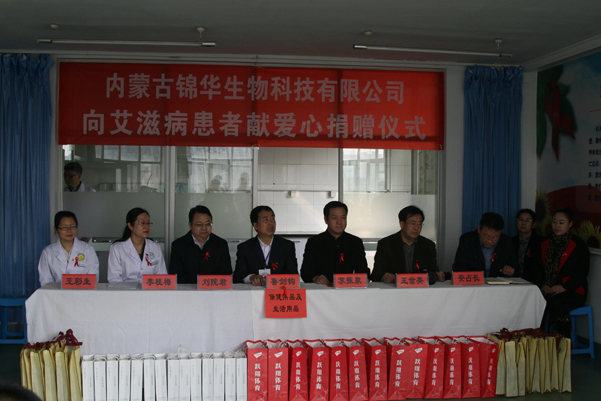 2017年4月5日上午,內(nèi)蒙古錦華生物科技有限公司總經(jīng)理蘇振泉及呼市地區(qū)高級(jí)營(yíng)銷總監(jiān)來到呼和浩特市第二醫(yī)院向13位艾滋病患者和醫(yī)護(hù)人員捐贈(zèng)錦華產(chǎn)品,以表錦華人的愛心。呼和浩特市人大副主任市紅十字會(huì)會(huì)長(zhǎng)魯劍鈞,呼市衛(wèi)生計(jì)劃委員會(huì)副主任劉院君,第二醫(yī)院院長(zhǎng)李桂梅等領(lǐng)導(dǎo)接受了捐贈(zèng)并講話。