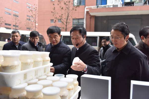 市委書記孫云飛(左三)、市政協(xié)主席王勝(左二)、市委常委常務副市長付新安(右一)、金寨縣縣長汪冬(左一)觀看菌瓶