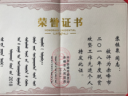 2019年3月,內(nèi)蒙古赤峰市委、市政府表彰了2018年度51個全市脫貧攻堅先進(jìn)集體和152名先進(jìn)個人,內(nèi)蒙古錦華集團(tuán)公司蘇振泉總經(jīng)理獲“脫貧攻堅先進(jìn)個人”榮譽(yù)。