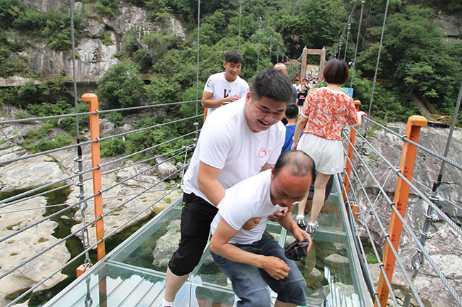 第二項(xiàng)行程:燕子河大峽谷。2019年8月25日早飯過后大家就踏上了新的征程,沿途景色很美,不知不覺就來到了挑戰(zhàn)神經(jīng)的玻璃棧道,站在上面真的是很崩潰啊,因?yàn)椤扒奥泛荛L,腳下還遠(yuǎn)”。終于在大家的互相攙扶中克服了內(nèi)心的恐懼,走過了玻璃棧道,結(jié)果迎接我們的是滑道,又是一段的速度與激情啊。